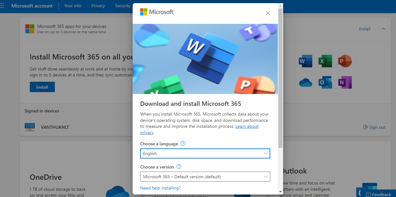 - Sau khi phương thức thanh toán của bạn được xác nhận, bạn sẽ được chuyển tới account.microsoft.com để cài đặt ứng dụng Office.